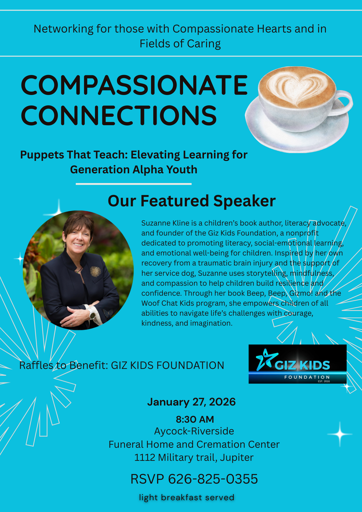 On January 27, 2026, Giz Kids Foundation founder Suzanne Kline was honored as a featured speaker at the Compassionate Connections networking event in Jupiter, Florida. She shared the mission of Giz Kids Foundation and the Woof Chat Kids program, highlighting how puppetry, storytelling, and collaboration with child life specialists and educators help children build confidence, resilience, and emotional well-being.